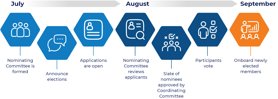 Anyone who works for an organization that is a current eHealth Exchange participant is eligible to apply for a Coordinating Committee seat. Representatives serve three-year terms. Applications are open for submission in July and voted on by their peers in August. Terms begin in October.